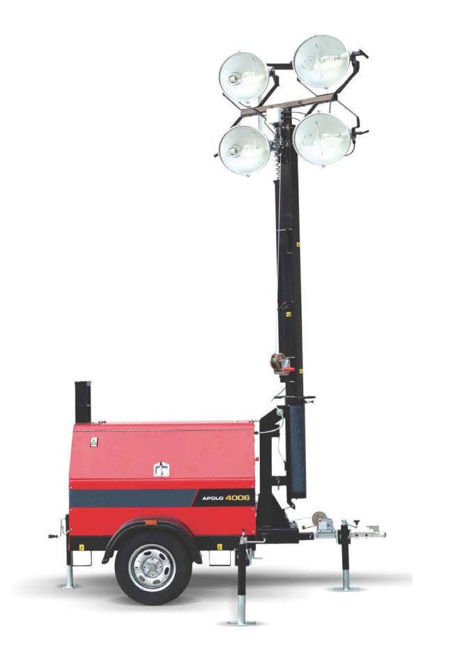 La torre de iluminación de la familia Apolo 4000 destaca por su funcionalidad y fácil manejo. La Apolo 4000 garantiza un funcionamiento continuo durante 60 horas por tanque de combustible ofreciendo un mayor rendimiento. La nueva familia de torres incorpora un diseño innovador y responde a estrictos estándares de seguridad, portabilidad, mantenimiento y versatilidad.